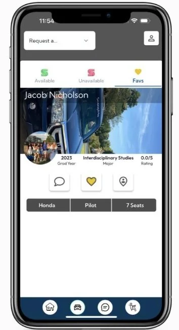 Our service also features a rider dedicated driver-board. This gives student riders a detailed list of local classmates who are either available for a ride, or already busy giving one.